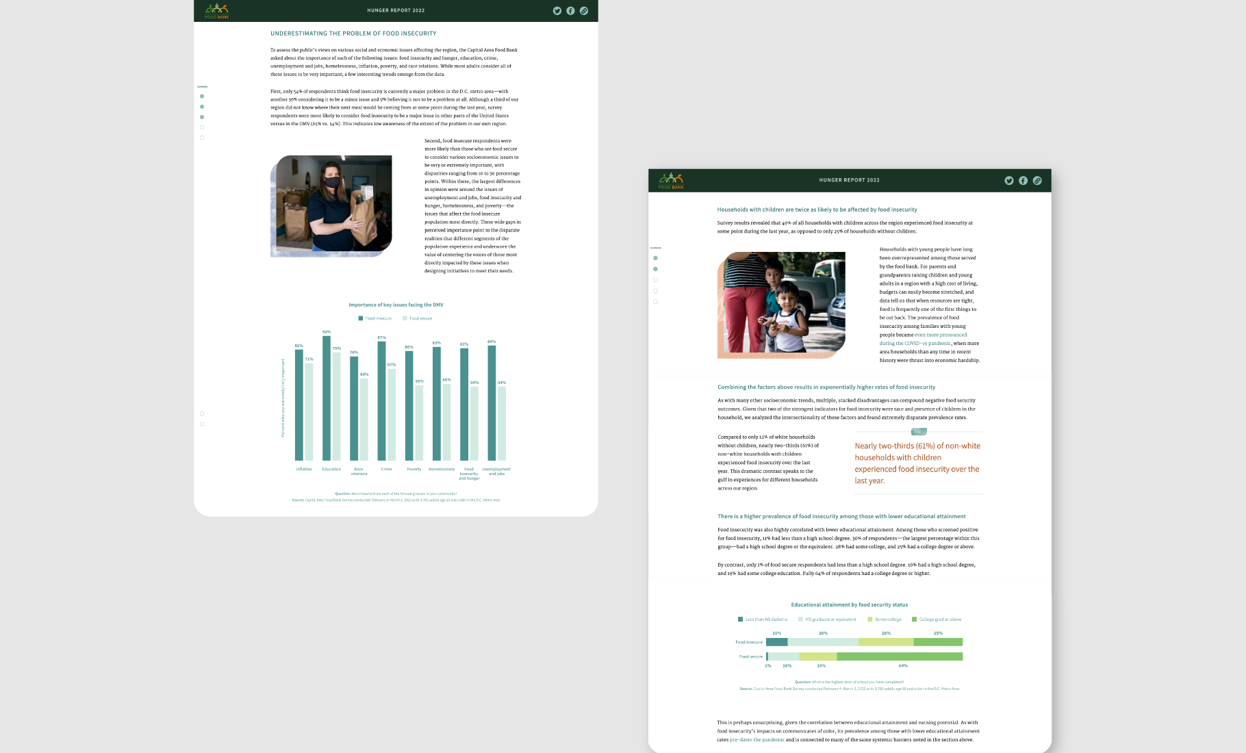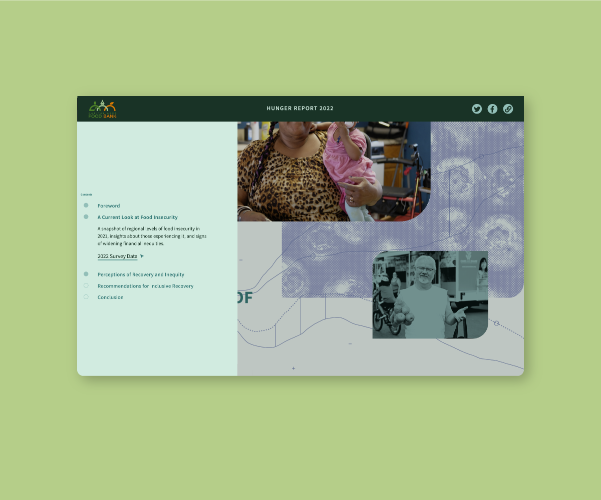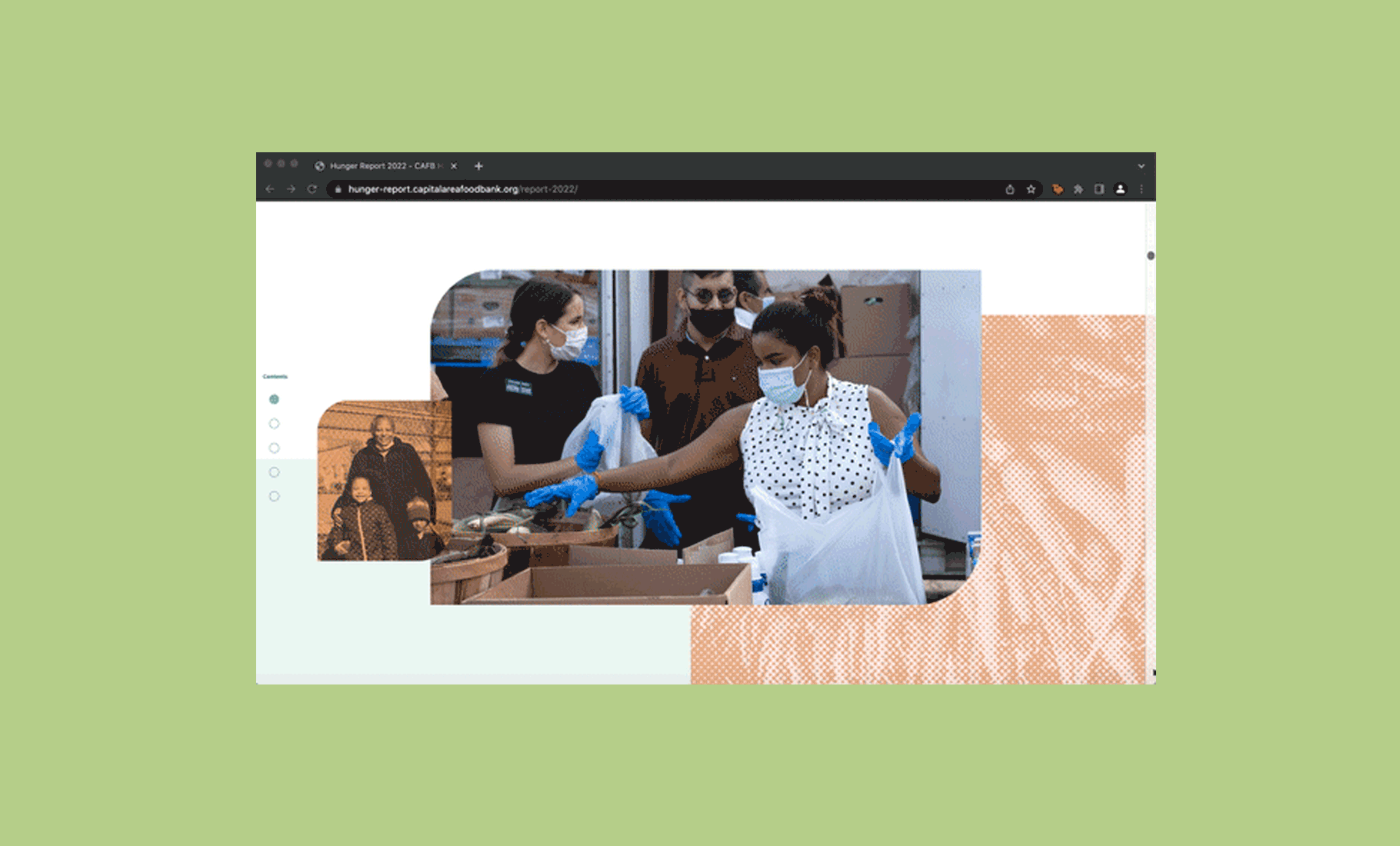 For the third year in a row, Eighty2degrees partnered with CAFB to work on their annual Hunger Report microsite. This year’s report was a bit different from the previous, as it focused on the food bank’s client narratives to tell the story of food insecurity alongside the numbers. Through graphs, video testimonials, imagery, and infographics, the report showcased inequities in the region and provided solutions for an “inclusive recovery”.
